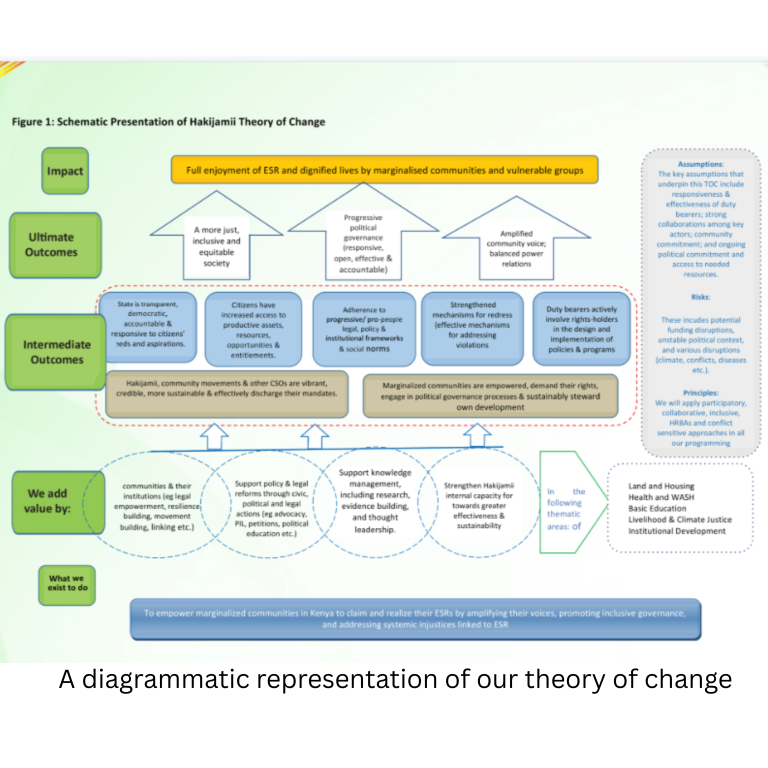 Hakijamii believes that addressing the root causes of exclusion and marginalization – commonly non-progressive legal, policy and institutional frameworks, retrogressive norms, and capacity constraints - is a major prerequisite to attaining a just and inclusive society where everyone accesses fundamental rights and lives in dignity. Our work is rooted in the belief that empowering communities by providing them with the skills and tools to claim and enjoy their ESR is a prerequisite for social transformation. We understand in this regard that only if empowered and resilient communities demand their rights, and duty bearers are responsive and held accountable, and pro- poor policies are fully implemented, will greater justice, equity, and access to ESR be attained. To achieve this ambition, Hakijamii is cognizant that it must address three factors which have contributory and reinforcing tendencies towards socio-economic injustices, viz: a) Non-enforcement of pro-poor policy, legal and institutional regimes. b) Inadequate capacity of citizens, state and non-state development actors; and c) Retrogressive societal norms, perceptions and practices.